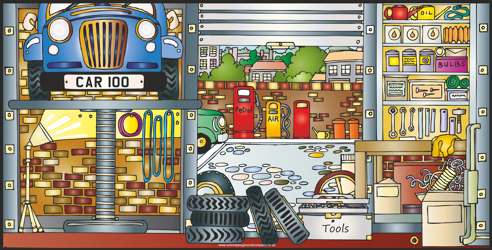 Perfect Size for Large Displays: Measuring 1.2m x 2.4m, this large garage scene provides a realistic, life-like backdrop, ideal for large role play areas, community spaces, or educational environments.